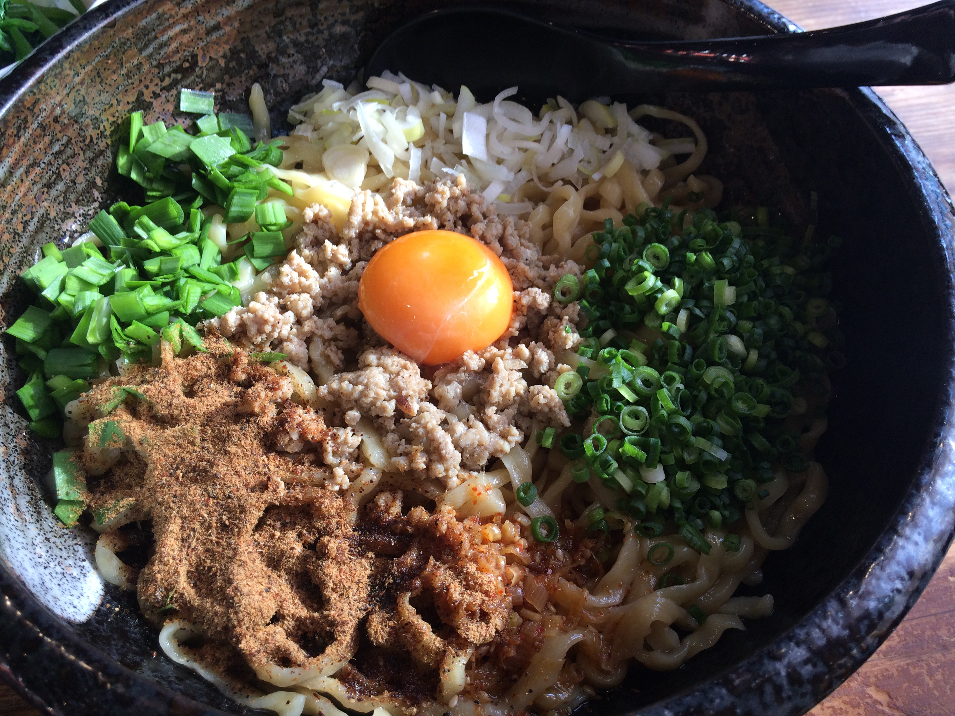ひき肉やネギ、ニラ、魚粉、ちょっとピリ辛のたれ、生卵。しっかりとした太麺。量が半端ないのである。